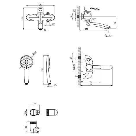 • Аксессуары в комплекте: шланг 1,5 м, 3-функциональная лейка Ø106х235 мм, настенное поворотное крепление